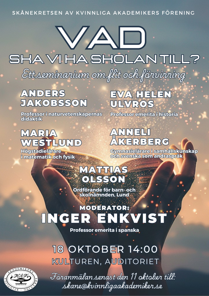 Skånekretsen bjuder in till seminarium om utbildning och skola! Seminariet är gratis och öppet för allmänheten, men KAF:s medlemmar har företräde. Anmälan sker till skane@kvinnligaakademiker.se senast den 11 oktober. Varmt välkommen!